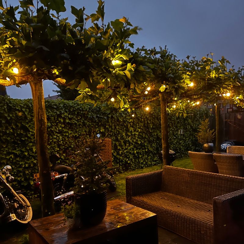 Cette guirlande guinguette peut être reliée à toutes nos guirlandes guinguettes. La longueur du câble avant le premier raccord et après le dernier raccord est égale à la moitié de la longueur du câble entre 2 raccords. Avec l'interconnexion, vous avez donc exactement la même longueur entre les raccords. La connexion traversante est possible grâce à des connecteurs à vis simples et étanches.