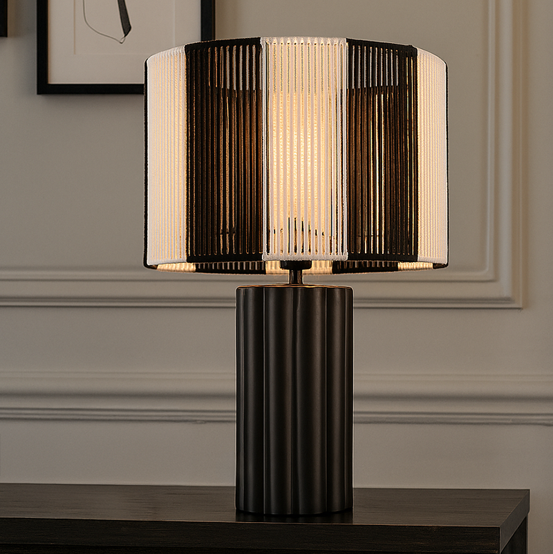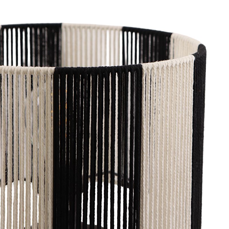 La lampe de table rustique en tissu Juno est de couleur noire. La lampe de table noire est fournie sans source lumineuse correspondante. Dans cette lampe, une source lumineuse avec un raccord E27 et la puissance maximale de la source lumineuse ne doit pas dépasser 40 watts.