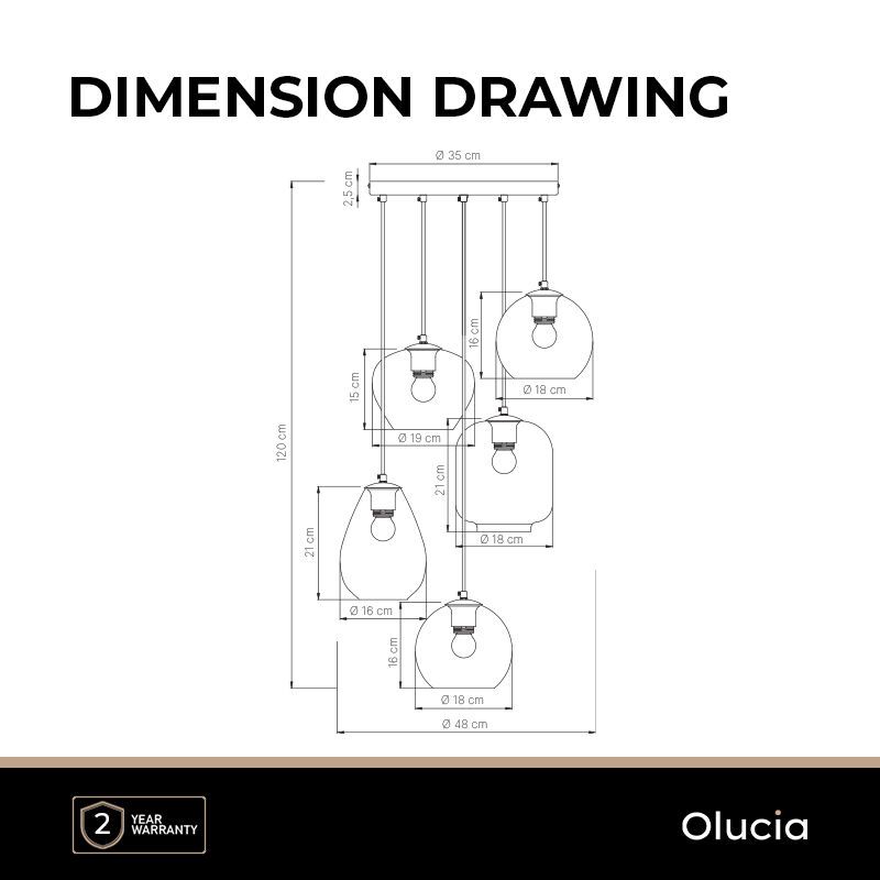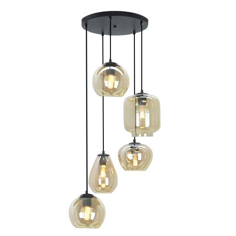La suspension moderne en verre Caia est de couleur ambre. La suspension ambre est fournie sans sources lumineuses correspondantes. Cette lampe doit contenir 5 sources lumineuses avec raccords E27. La puissance maximale des sources lumineuses ne doit pas dépasser 40 watts par ampoule.