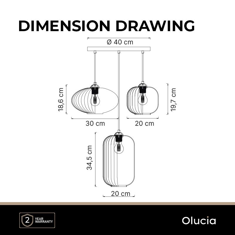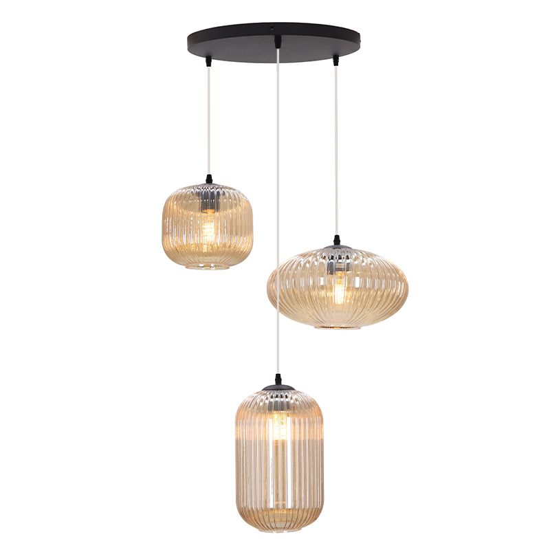 La suspension rétro en verre Charlois est de couleur ambre. La suspension ambre est fournie sans sources lumineuses correspondantes. Cette lampe doit contenir 3 sources lumineuses avec raccords E27. La puissance maximale des sources lumineuses ne doit pas dépasser 40 watts par ampoule.