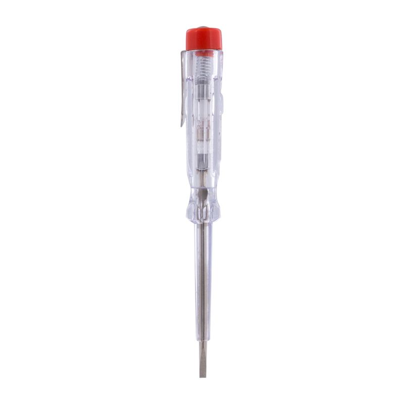 Voulez-vous vérifier si un câble est sous tension ? C'est facile avec notre détecteur de tension. Lorsque le testeur de tension sent une résistance électrique, la lampe s'allume et vous savez qu'il y a de la tension. Vous vérifiez la tension électrique en tenant la pointe du testeur de tension contre le câble, tandis que votre doigt est contre l'extrémité du testeur de tension.